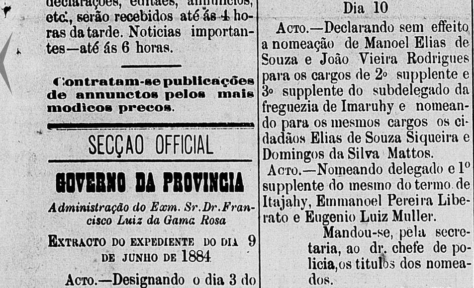 Domingos da Silva Mattos foi nomeado 3º Suplente do Subdelegado de Imaruí em 10.06.1884, publicado no "A Regeneração" dia 15.06.1884.